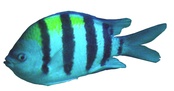 Yellow back and five dark vertical bars on pale body, but no streaks on tail fin. Read more…