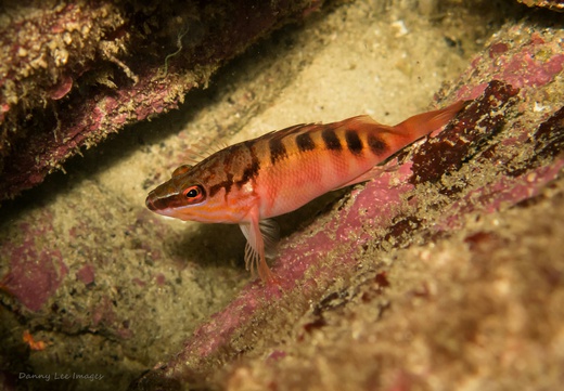This fish is dark brown across its back with a pink middle and light pink underbelly. Distinct thin light bands vertically down its body that appear to fade midway down. Has a white dot on its ‘ear’ or opercle.Known from northern New South Wales to the north and north-east of Tasmania. Rare sightings at Maria Island. Log it if you spot it south of Bicheno TAS or west of Wilson's Promontory, VIC. Read more…