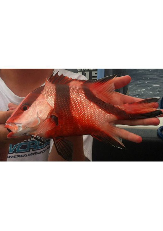 Very distinctive fish in the juvenile and young adult stages. Three dark red bands cross the body vertically. One runs diagonally forward from the front of the dorsal fin, another from the middle of the dorsal fin and the third runs diagonally backwards from the rear of the dorsal fin. In large adults the bands disappear and the fish becomes a bright red. Read more…