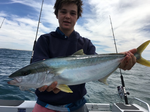 This is a Yellow Tail Kingfish Dad and I had heard that they were in the area which they rarely are and attempted to catch them. We were successful on this occasion managing to get a school around us. The ones we caught were all around the 70 cm mark but I had a large Kingfish at an estimate maybe 11kg take our large rod with a squid floating on the surface. The Kingfish got off but I have footage of the fight and the kingfish is visible in the waters depth in the footage for a brief moment.