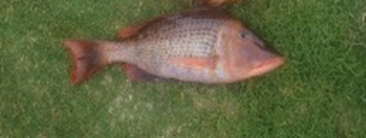 Body silvery, tan or yellowish, base of scales often black, often a series of 8 or 9 bars. Base of pectoral fins red. Sometimes a red streal originating on upper operculum, passing beneath eye an onto snout. Lips reddish. Fins pale or reddish. Bright red dorsal fin and red patch at base of pectoral fin. Read more…