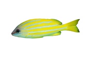 Adults have large eyes, their body is bright yellow in colour with 5 horizontal bright blue stripes running the entire length of the body. The blue stripes have faint black edges. The underside is a light yellowish silver shade. Fins are yellow. Older fish have a black head and a yellow underside. Some individuals may have a faint black spot, larger than the eye, below the rear of the dorsal fin. Read more…