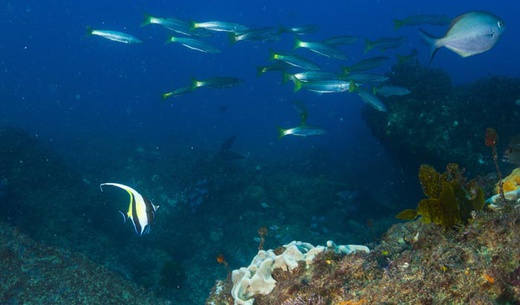 Distinctively shaped fish with a shield shaped body, pointed mouth and elongated dorsal fin. Colouration is also a distinguishing feature with black and white vertical bands across the body. A yellow area with faded edges is found in the centre of the body and towards the tail. A bright yellow to light orange marking crosses the tubular mouth. The elongated dorsal fin is white and decreases in relative length as the fish grows. Eyes are high on the face. In older fish lumps form above the eyes. Read more…