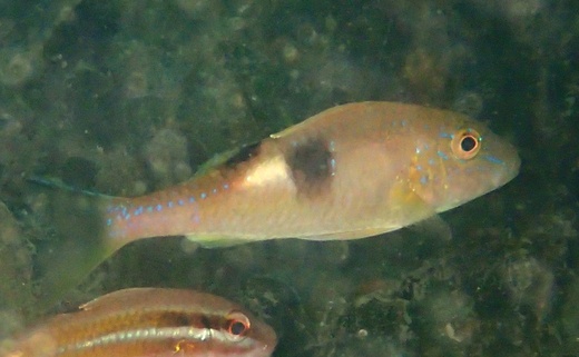The body is pinkish white with a large oval shaped black spot followed by an often-elongated white spot. In some individuals the spots may be of the same size and shape. In others the spots differ substantially. Barbels are a lighter shade of the body colour. A black marking is at the base of the second dorsal fin. In some individuals this extends onto the upper portion of the tail. In some fish the scales may have white edging, producing a mottled look, especially around the head. Read more…