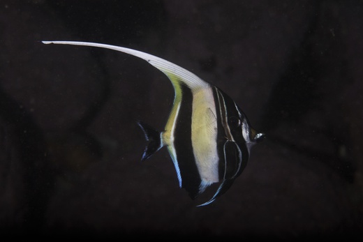 Distinctively shaped fish with a shield shaped body, pointed mouth and elongated dorsal fin. Colouration is also a distinguishing feature with black and white vertical bands across the body. A yellow area with faded edges is found in the centre of the body and towards the tail. A bright yellow to light orange marking crosses the tubular mouth. The elongated dorsal fin is white and decreases in relative length as the fish grows. Eyes are high on the face. In older fish lumps form above the eyes. Read more…