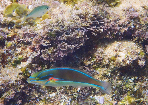 The redspot wrasse changes in colouration as it grows, matures and changes sex. It transitions through two phases – initial (females) and terminal (transition between female and male). In the adult phase the fish changes sex to male and the colouration is altered. The body is brownish green on the upper half and light blue to white on the lower half. Four thin, wavy iridescent blue lines begin at the mouth and behind the eye and run horizontally along the body. The orange spot at the base of the transparent pectoral fin in the initial phase darkens to be a deeper red. The cheeks are faint yellow. Read more…