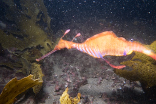 These relatives of seahorses have distinctive leaf-like appendages protruding from a few parts of the brown-red body. The body has longitudinal blue bars on parts of the body, small yellow spots on the body and head, and white spots on the snout. Males brood red eggs on the underside of the tail. Males brood red eggs on the underside of the tail. Read more…