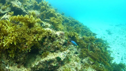 Juveniles have a greenish brown upper body with blue underside. Faint pink and purple irregular bands adorn the face. A black spot is found on the dorsal fin and another near the base of the tail. Caudal and anal fins are transparent. Adults have a green to blue body with bright pink bands in irregular patterns on the face. The caudal fin is yellow in the centre, darker on the edges and moon shaped. The pectoral fins are elongated, pink in the centre and fringed in blue. Scales have faint pink edges. Some individuals have pink markings along the dorsal fin tips. Read more…