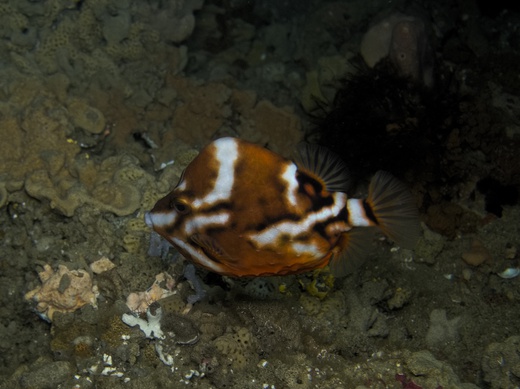 A boxfish with a concave snout and a high arched back. Males and females differ in colour – males are orange with a few white bands on the body. In females and juveniles, the white bands are outlined in black. Read more…