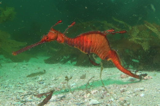 These relatives of seahorses have distinctive leaf-like appendages protruding from a few parts of the brown-red body. The body has longitudinal blue bars on parts of the body, small yellow spots on the body and head, and white spots on the snout. Males brood red eggs on the underside of the tail. Males brood red eggs on the underside of the tail. Read more…