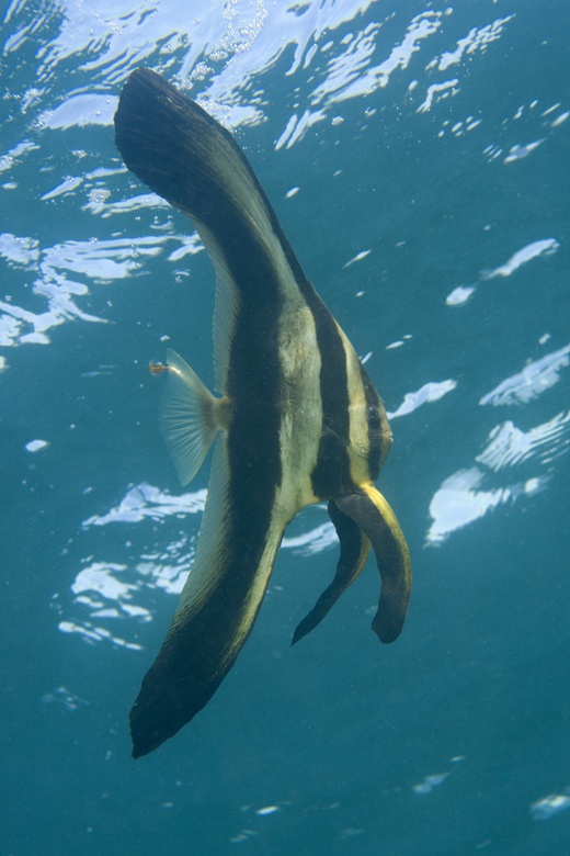 Round body profile with two distinct vertical dark bars, one through the eye and one behind the gill cover. Dark blotch below the pectoral fin (more intense than in Platax teira) and no second spot. Read more…