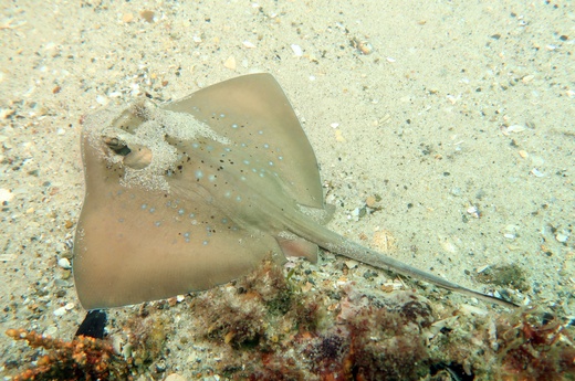 Dusky brown-grey oval shaped body with long thin tail. Blue spots adorn the upper body disc. Some individuals have dark shading beneath the eyes and on the brow ridge. Tail is grey-white with white banding along the tip, with spines originating from the middle upper surface. Read more…