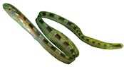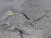This fish has a long eel-like body. The dorsal fin runs the majority of the dorsal surface, beginning from above the eye and ending on the tail. The anal fin is also elongated but begins closer to the tail. Pelvic fins have adapted as two fin rays that are used for control when the species extends its head from burrows. The body is a light brownish-yellow colour with vertical dark brown bars. Some individuals have blue markings around the head and dorsal fin edges. Larger fish have a blue-ringed black spot on the dorsal fin above the gills. This species is easily distinguished from other blennies. Read more…