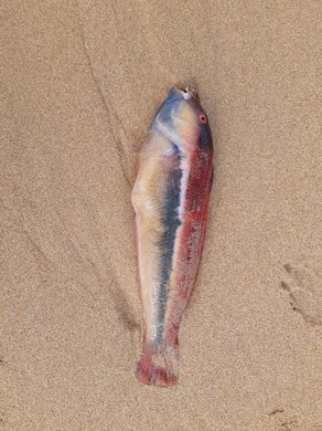 Larger fish have bright blue tattoo markings around the eyes and face. Females and juveniles have three long stripes along the length of the body. These longitudinal stripes are red-brown at the top, a thin white stripe in the middle and a green belly stripe. The males have a greener colour on upper body and often have a black and white stripe running the length of their body.Log the southern maori wrasse wherever it is spotted in Tasmanian waters. Read more…