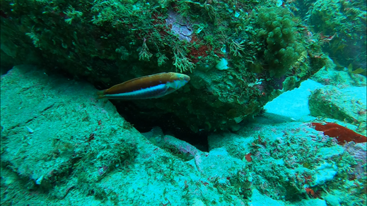 Larger fish have bright blue tattoo markings around the eyes and face. Females and juveniles have three long stripes along the length of the body. These longitudinal stripes are red-brown at the top, a thin white stripe in the middle and a green belly stripe. The males have a greener colour on upper body and often have a black and white stripe running the length of their body.Log the southern maori wrasse wherever it is spotted in Tasmanian waters. Read more…