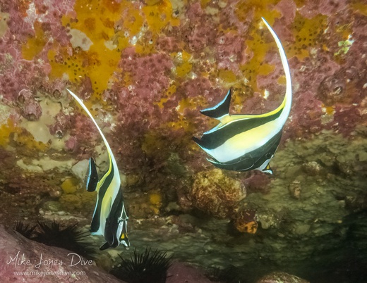 Distinctively shaped fish with a shield shaped body, pointed mouth and elongated dorsal fin. Colouration is also a distinguishing feature with black and white vertical bands across the body. A yellow area with faded edges is found in the centre of the body and towards the tail. A bright yellow to light orange marking crosses the tubular mouth. The elongated dorsal fin is white and decreases in relative length as the fish grows. Eyes are high on the face. In older fish lumps form above the eyes. Read more…