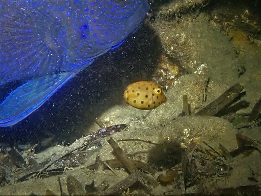 Ostracion cubicum (Yellow Boxfish) Deep inside a cavern cohabitated by Blue Devils, 4m depth on a night dive Tweet Depth 4m