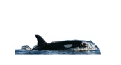 The killer whale is the largest of all dolphins. It has a robust black body with a distinct white patch behind the eye that will vary in shape depending on the type of killer whale. There is a grey saddle located behind the dorsal fin which is also variable in shape. The underside is white along the length of the body and extends to the flank in a lobe at two thirds the way along. They have blunt nose (rostrum), large round flippers and broad flukes. The dorsal fin differs in the sexes, with males having a large tall triangular dorsal fin up to 1.8 m tall and females having a smaller curved dorsal fin. The blow is medium sized and bushy. Read more…