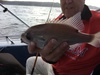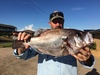 This species has a large head, mouth and eyes in relation to body size. Silvery body with visible scales that have a pearly sheen and small brown spots. Distinguishing features are a bony shield at the top of the gill opening and a black spot on the trailing end of the dorsal fin. Juveniles have a vertical brown band that crosses the eye roughly diagonally. Read more…