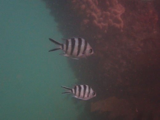 Five dark vertical bars on pale body and a black streak at top and bottom of tail fin. Read more…