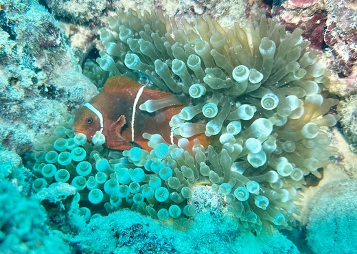 Bright red-brown anemonefish with three narrow white to grey bands on the head and body and a large rearward-facing spine on the gill cover running from the rear of the eye to the first white stripe. Males are 2-3 times smaller and more brightly coloured than females. Read more…