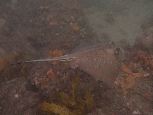 Dusky brown-grey oval shaped body with long thin tail. Blue spots adorn the upper body disc. Some individuals have dark shading beneath the eyes and on the brow ridge. Tail is grey-white with white banding along the tip, with spines originating from the middle upper surface. Read more…