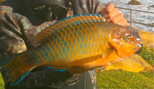 Three phases are evident in their characteristics. Juveniles are dull in colouring, usually a light brown, with faint horizontal lines along the body. With age, these lines form thick vertical bars. During the initial phase (female) they are a light yellowish orange with five vertical blue bars, which is created by scales with a blue edging. The underside is lighter and the tail has blue edging. During the terminal phase, which is the transition from female to male, the colouring brightens to a greenish blue. Scales have a pinkish edging and fins are bluish green with pink stripped sections. Read more…