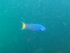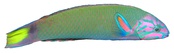 Juveniles have a greenish brown upper body with blue underside. Faint pink and purple irregular bands adorn the face. A black spot is found on the dorsal fin and another near the base of the tail. Caudal and anal fins are transparent. Adults have a green to blue body with bright pink bands in irregular patterns on the face. The caudal fin is yellow in the centre, darker on the edges and moon shaped. The pectoral fins are elongated, pink in the centre and fringed in blue. Scales have faint pink edges. Some individuals have pink markings along the dorsal fin tips. Read more…