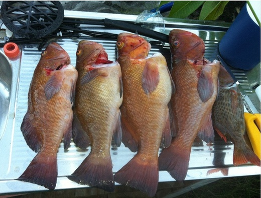Body silvery, tan or yellowish, base of scales often black, often a series of 8 or 9 bars. Base of pectoral fins red. Sometimes a red streal originating on upper operculum, passing beneath eye an onto snout. Lips reddish. Fins pale or reddish. Bright red dorsal fin and red patch at base of pectoral fin. Read more…