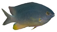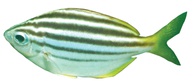 The Indo-Pacific sergeant has a yellow back and five dark vertical bars on a pale body, but no streaks on tail fin (like Abudefduf sexfasci…