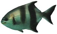 Deep bodied with grey to brownish grey above and silver below with two broad dark bands. Length: Up to 46 cm