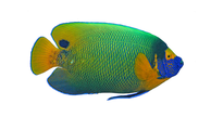 The Blueface Angelfish has a distinctive blue mesh-like mask on its face and cheeks with a yellow band across its eye and a blue spot on th…