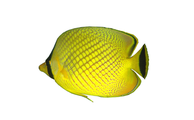 The Lattice Butterflyfish is a uniformly bright yellow reef fish with a pineapple-like pattern on the sides, a blue forehead with a black v…