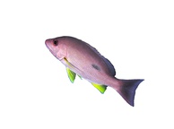 Wrasse like, bright red to reddish above and white below with prominent yellow blotches on side, prefers deeper areas and occasionally caug…