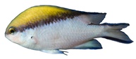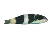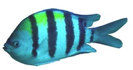 Juveniles have a black body and face with vertical white band running along the gills. A yellow bar is present on the top of the head betwe…