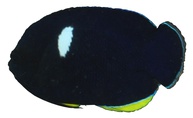 Body is black with a vertical white "keyhole shaped" marking behind the head and pectoral fins on both sides.This marking is how the specie…
