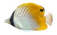 The blackback butterflyfish has the characteristically rounded rectangle butterflyfish body shape. Fins are white body with yellow edges. A…