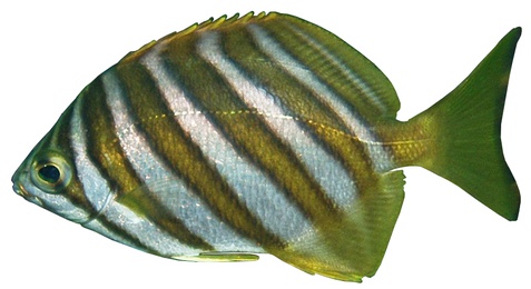 White with six distinctive brown edged yellow stripes which occur obliquely across the body and yellow fins.