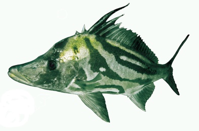 A large boarfish with a moderately deep, compressed body, exposed striated head bones, a low knob on the nape and a very long concave snout, that becomes longer and deeper with age. Greenish brown above, paler below, with 3 broad indistinct oblique stripes across the body. Adult males are sometimes peppered with yellow spots.
