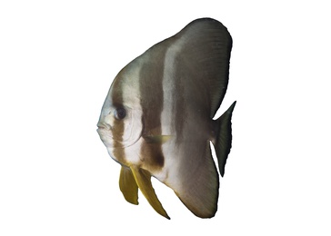 ADULTS: Light silver in colour. Dark vertical bands have faded from the juvenile stage but are still visible. Body has lengthened and the fish is less boomerang shaped and more triangular. Pelvic fins are yellow. In larger adults the head develops a hump above the eyes.