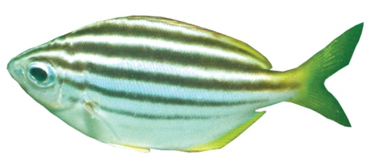 Common to the central New South Wales coast and also found in Victoria, Queensland and Tasmania. Mado are considered common in northern Tasmania and along the east coast and may be found south to Tasman Peninsula. Small reef fish, reach up to approximately 20 to 25cm. They can be identified by brown stripes running horizontally along the length of their silvery white body (longitudinal stripes). They also have yellow fins (dorsal, anal and caudal).