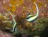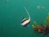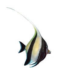Distinctively shaped fish with a shield shaped body, pointed mouth and elongated dorsal fin. Colouration is also a distinguishing feature with black and white vertical bands across the body. A yellow area with faded edges is found in the centre of the body and towards the tail. A bright yellow to light orange marking crosses the tubular mouth. The elongated dorsal fin is white and decreases in relative length as the fish grows. Eyes are high on the face. In older fish lumps form above the eyes.