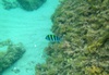 The Indo-Pacific sergeant has a yellow back and five dark vertical bars on a pale body, but no streaks on tail fin (like Abudefduf sexfasciatus - which it often schools with).
