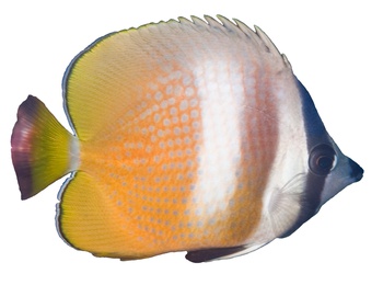 The body is yellowish brown with two white bars running vertically across the middle. A yellowish-brown bar is present in between the two white bars. The posterior section of the fish is a brighter yellow than the yellow-brown bar. A black bar crosses the eyes. Scales are tipped with light grey/white sections, which give the fish a white spotted look.