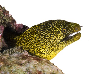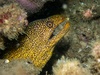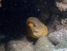 Irregular shaped yellow to white spots cover a dark brown body. Some individuals also have small black spots. The body colour gets darker further away from the head due to the presence of more markings. As with all moray species the Abbott’s Moray can be found with the head slightly visible at the entrance to a crevice, mouth open showing rows of white pointed teeth and the remainder of the body tucked well inside.
