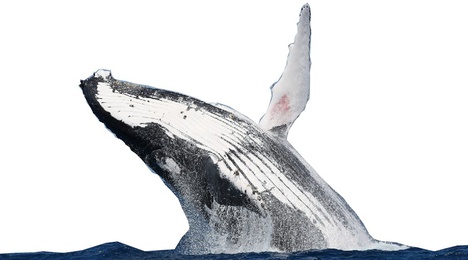 The Humpback whale can be distinguished by its uniquely large flippers which are approximately one third the length of the body. It is dark grey in colour and may have white markings scattered across the body. Its dorsal fin is variable in shape ranging from low and stubby to hook shaped and is usually position atop a raised hump at two thirds the way along the body. Humpback whales also have small 'knobs' on the rostrum known as tubicles which each contain a small hair. Generally speaking, southern hemisphere humpbacks have a white ventral side, while northern hemisphere whales have a darker ventral colouration. Several migratory feeding areas have been identified along the coasts of NSW, VIC and TAS.