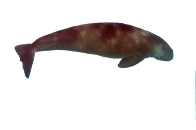 ADULTS: grey, lighter ventrally; long fusiform body with paddle shape front flippers and a horizontally flattened tail; no dorsal fin; distinctive head with mouth opening ventrally beneath a broad flat muzzle.